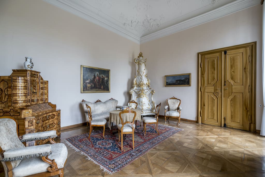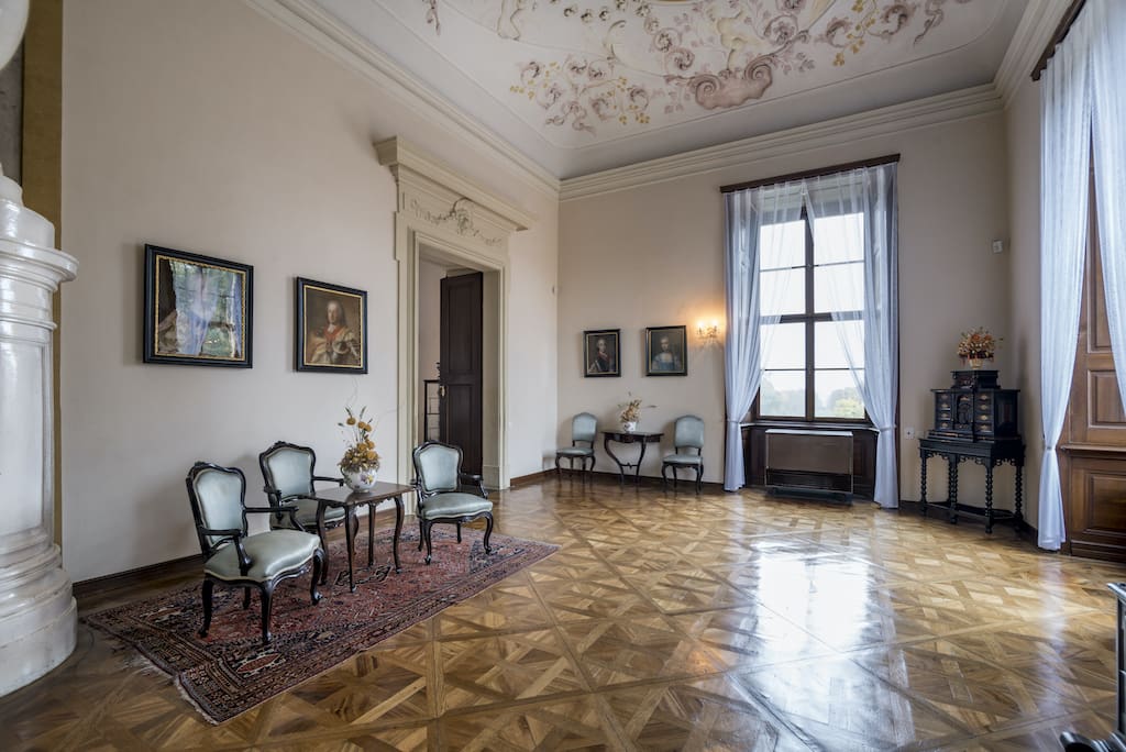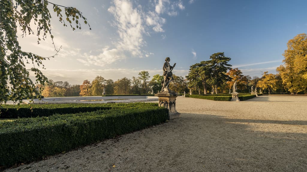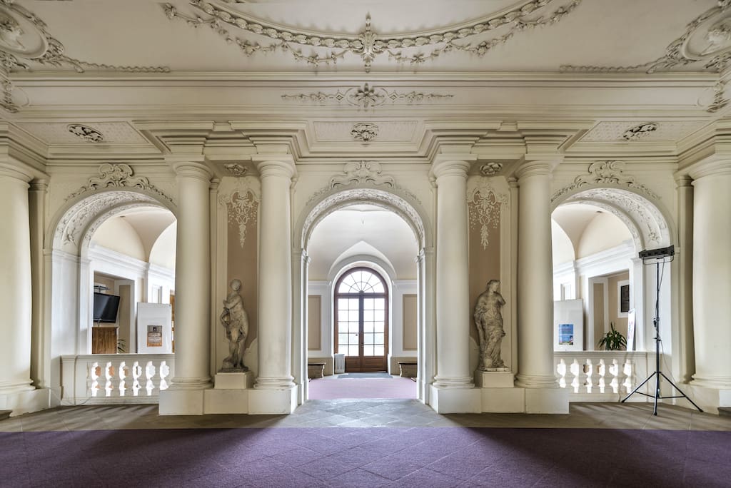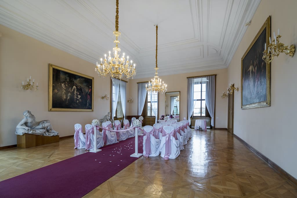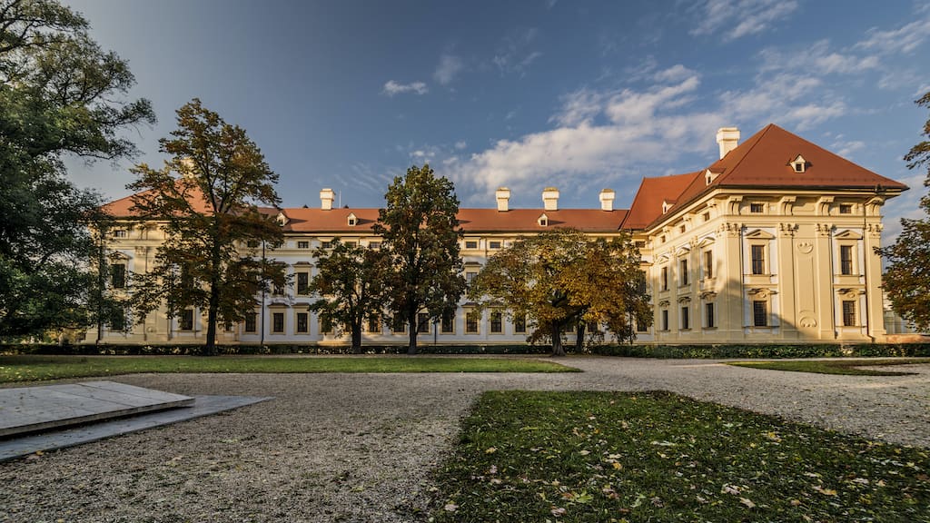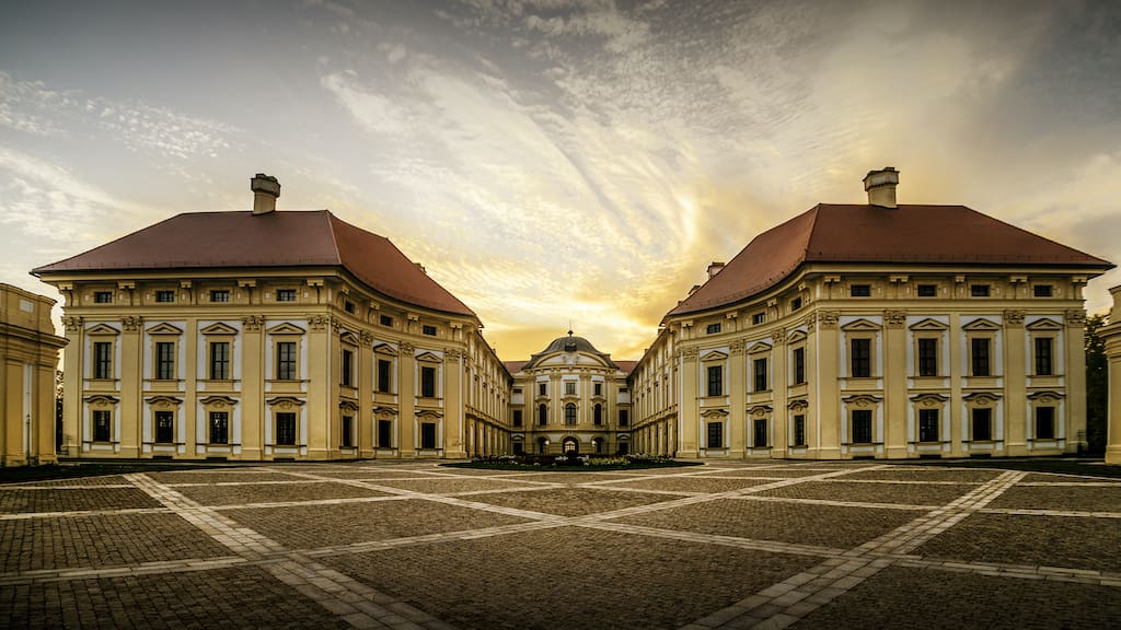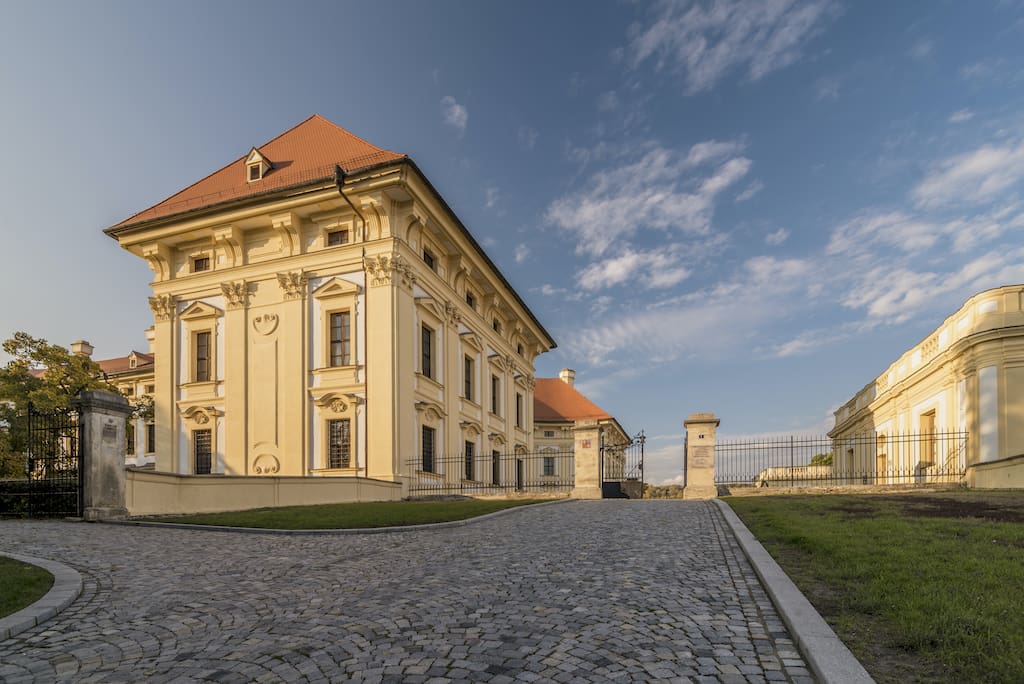 Rezidenci slavného rodu Kouniců vystavěli na přelomu 17. a 18. století. Součástí areálu byl už tenkrát park v módním stylu francouzských barokních zahrad. Zámecké interiéry jsou plné fresek, štuků, umělecké sochařiny a obrazů. Zcela výjimečný je centrální oválný Historický sál, v němž bylo památného 6. prosince 1805 uzavřeno příměří mezi Francií a Rakouskem.